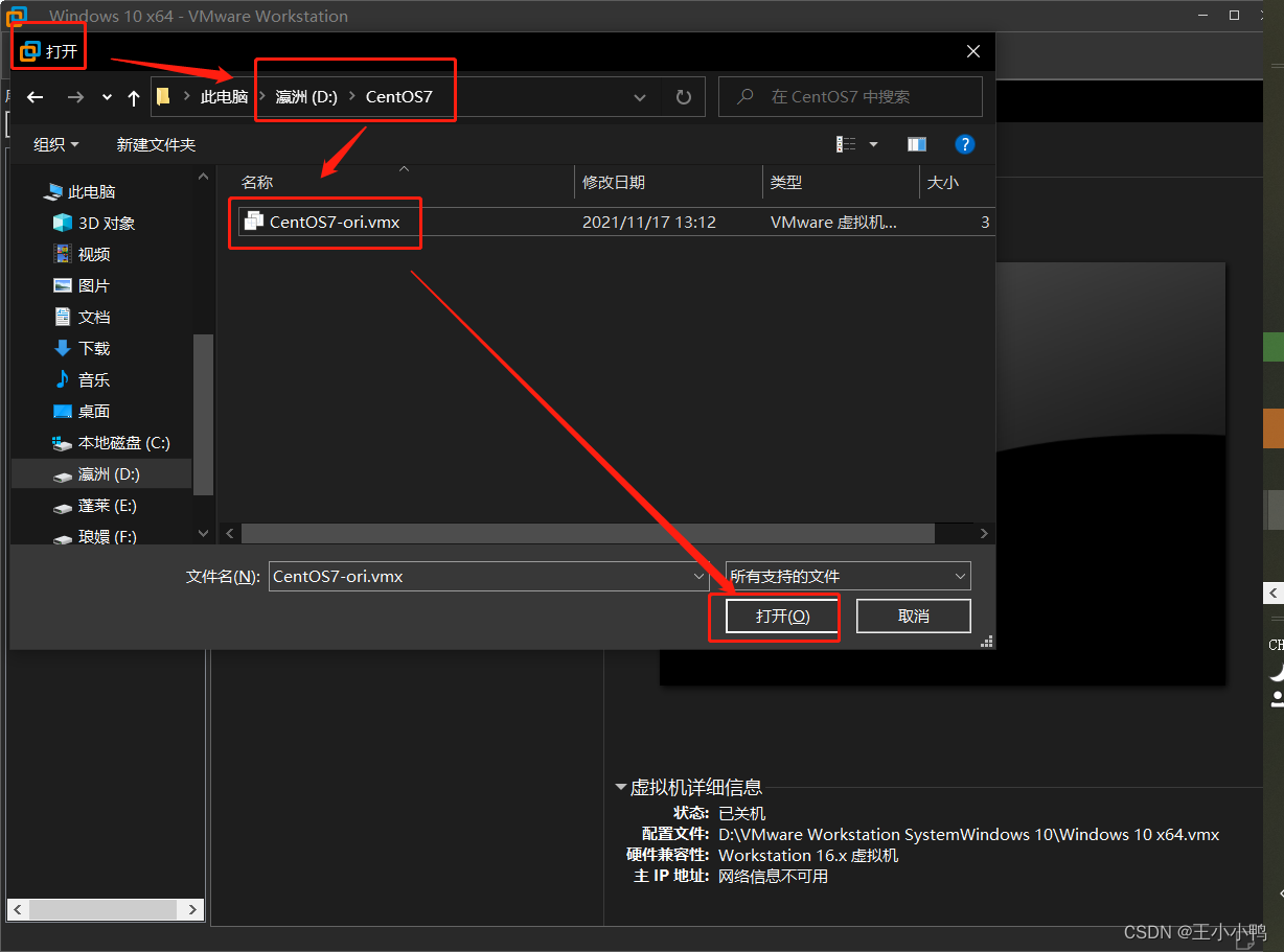1.2.2、VMWare 左上角菜单,文件—打开,找到解压出来的虚拟机目录,