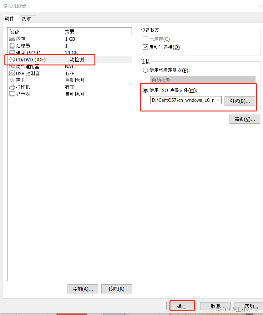 接下来就是最重要的CD/DVD(IDE)配置连接使用ISO映像文件
