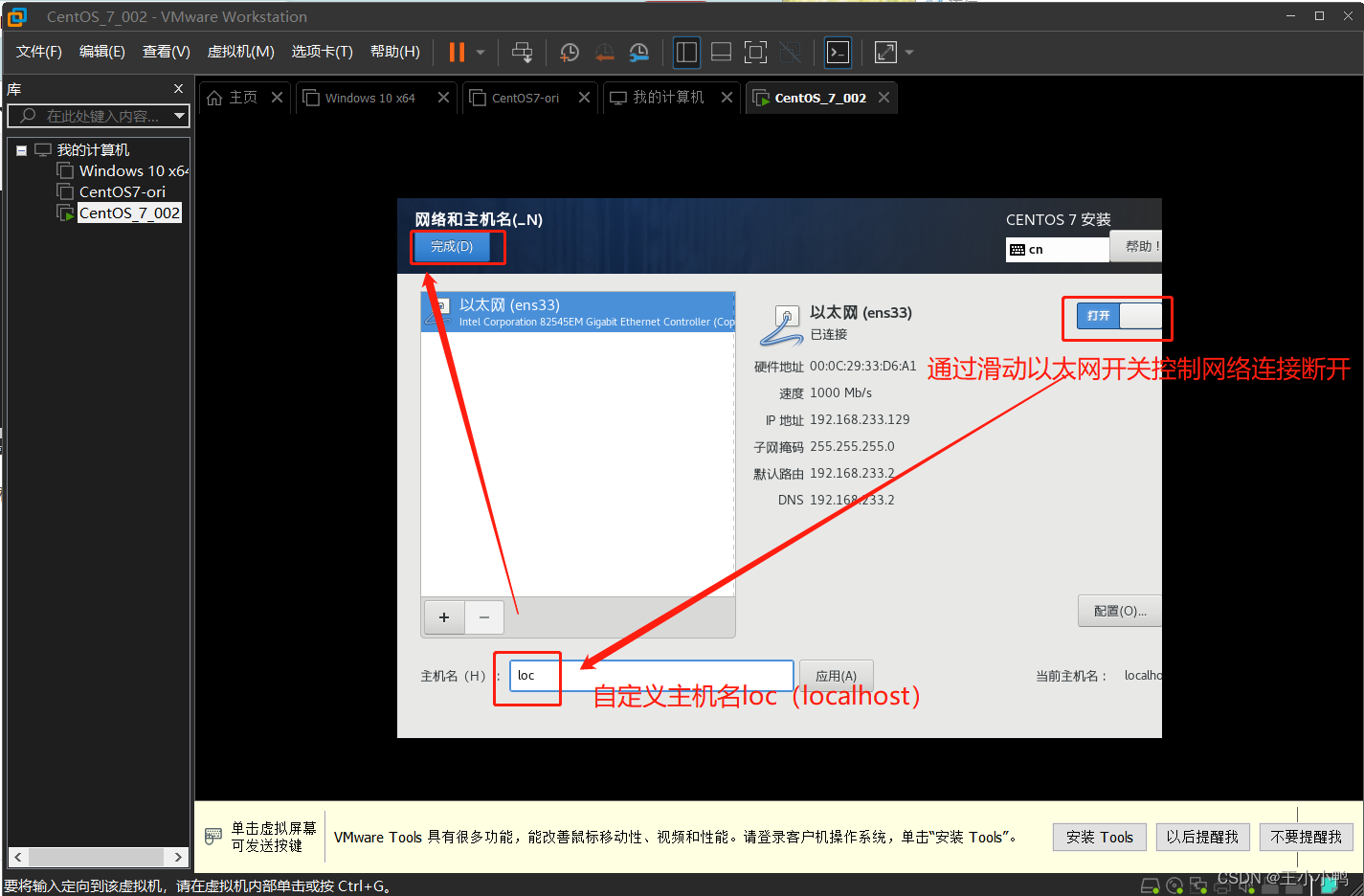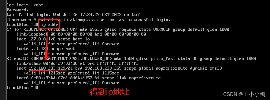 输入账号和密码进入以后,在界面输入“ip addr”找到ip地址 192.168.233.129