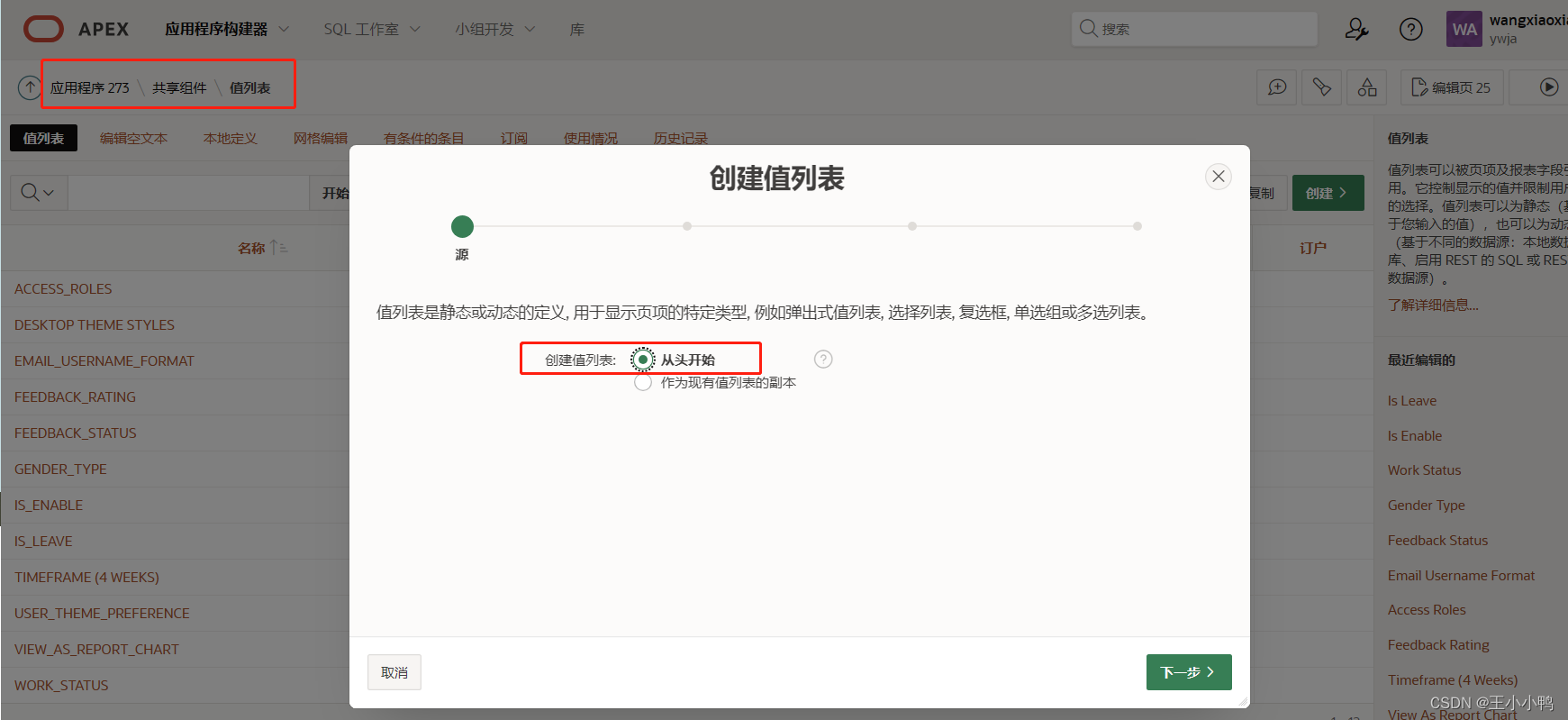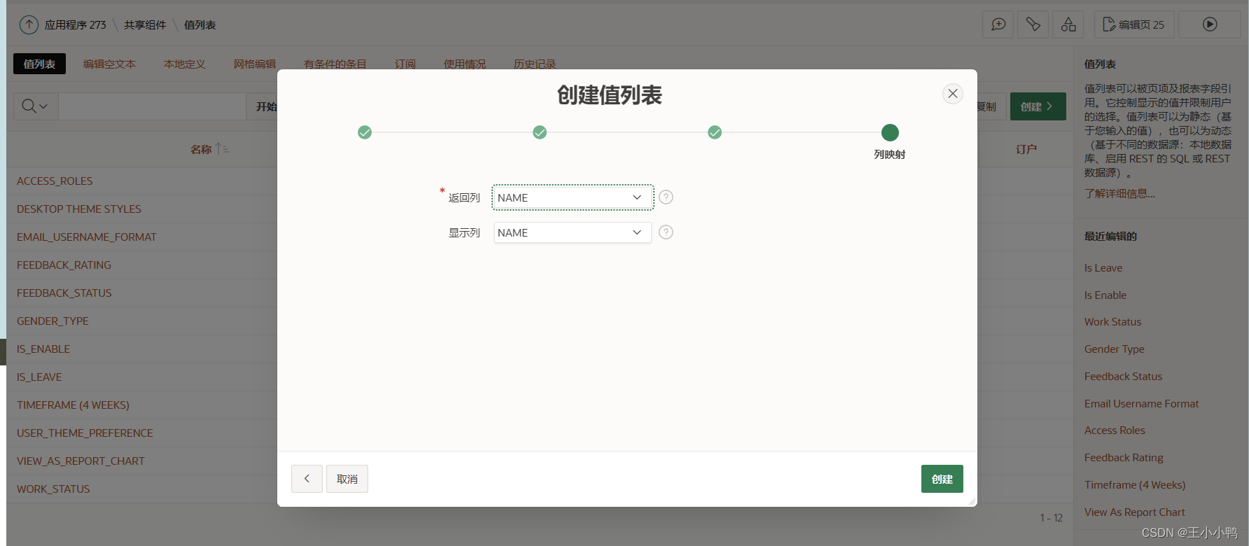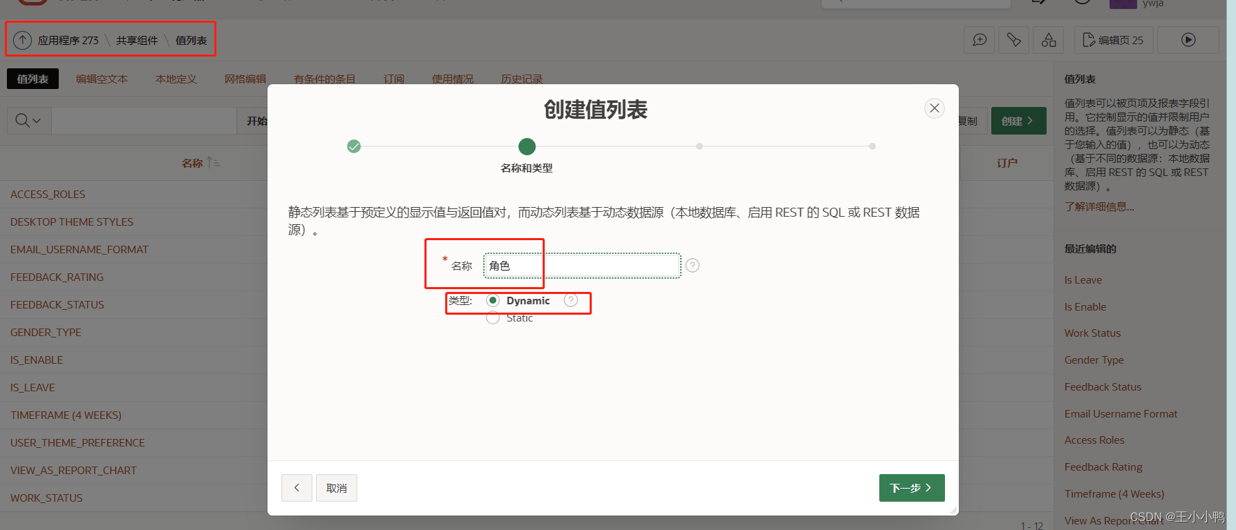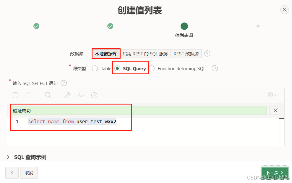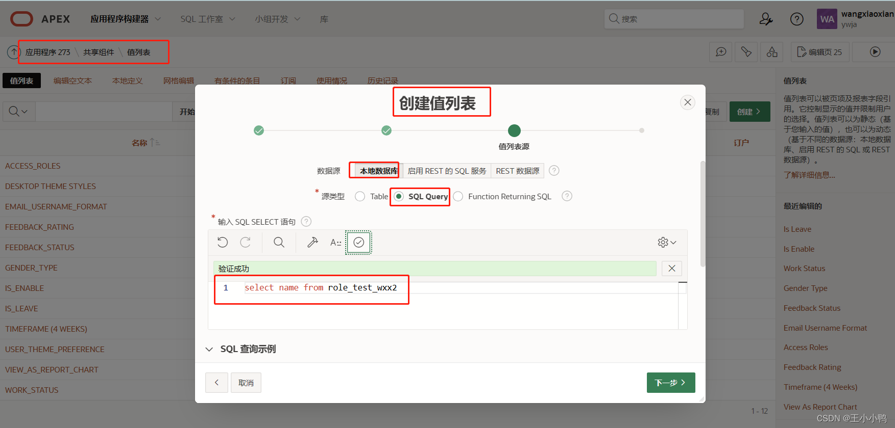 创建值列表:从头开始 → 自定义名称 → 类型:动态Dynamic → 本地数据库 → sql查询 → 编辑sql查询语句 → 验证通过 → 返回列 显示列