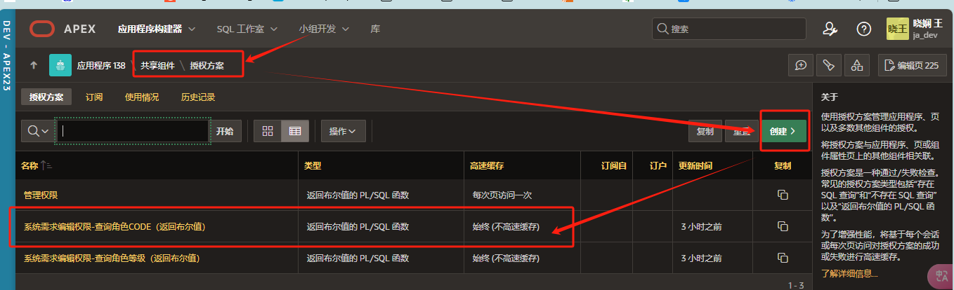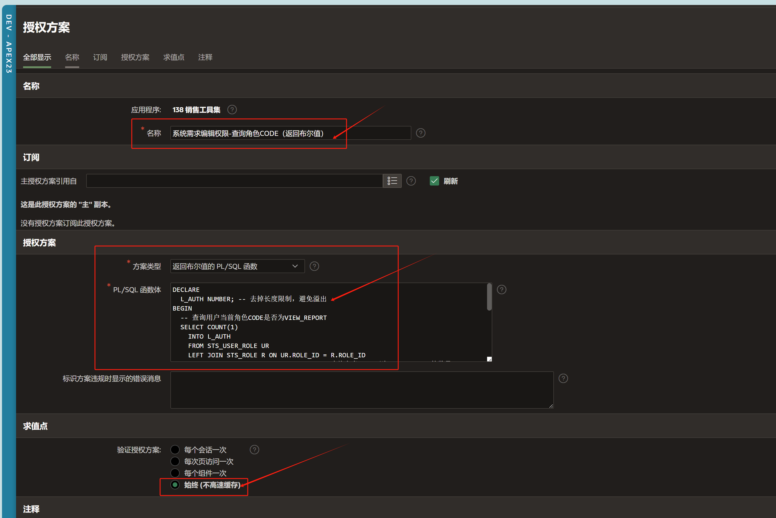 在应用→共享组件→授权方案→创建名为“系统需求编辑权限-查询角色CODE(返回布尔值)”的方案,代码如下