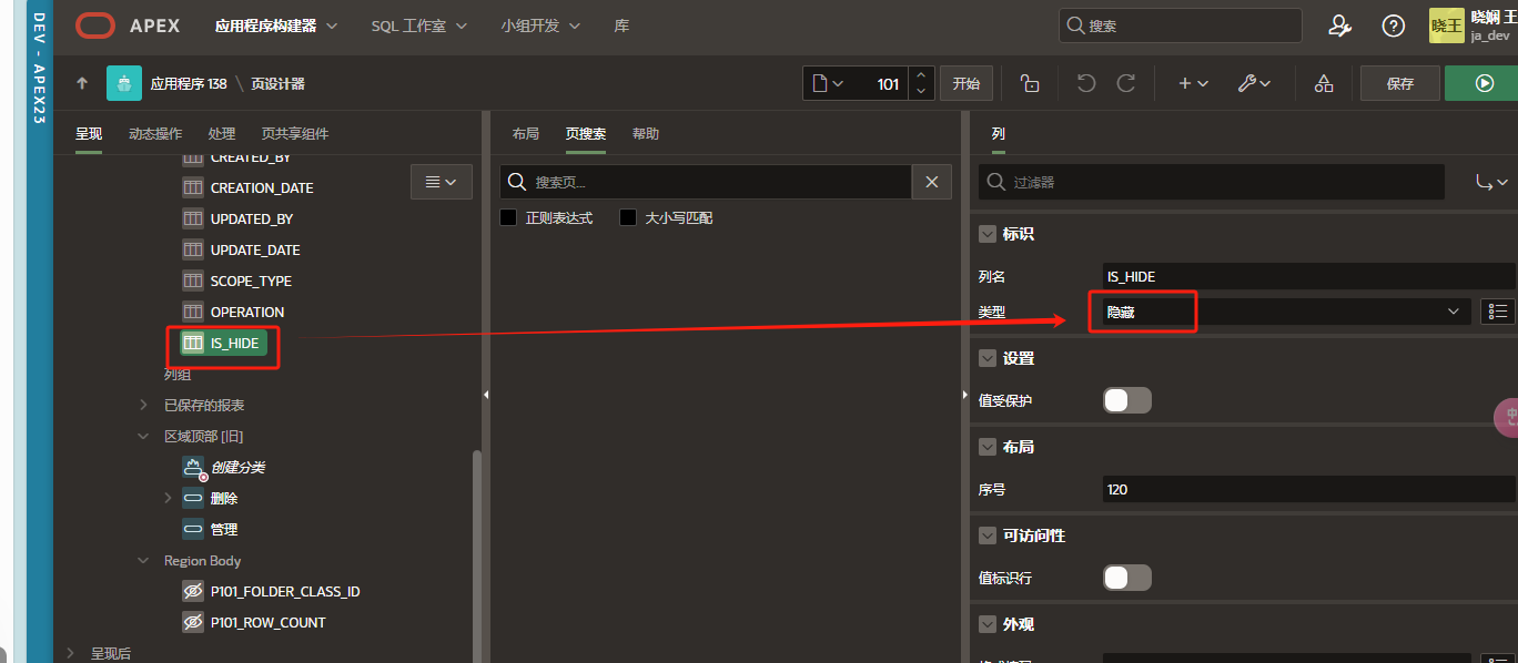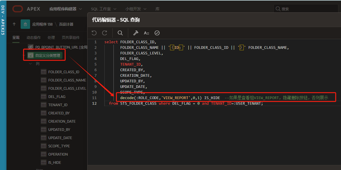 在交互式网格SQL定义IS_HIDE,定义依是登录用户的当前角色code,类型设置为隐藏