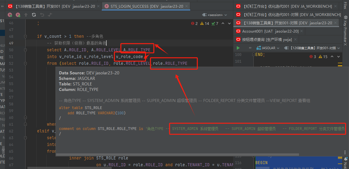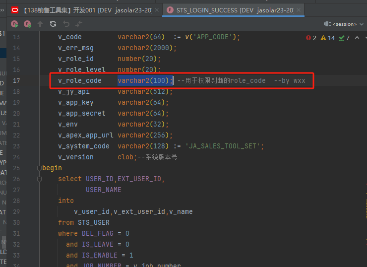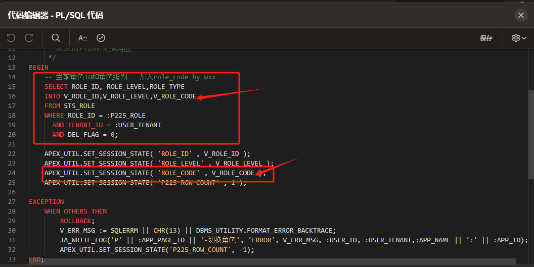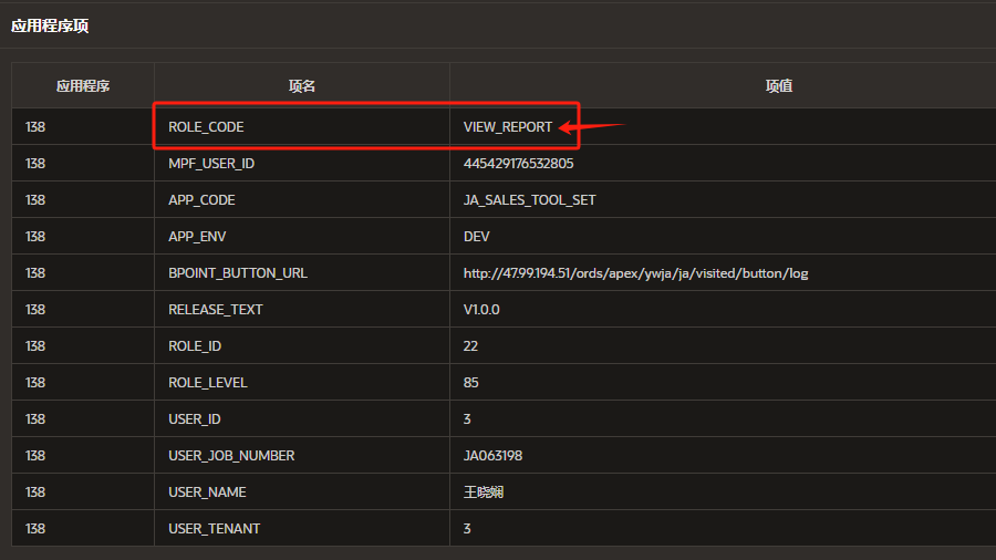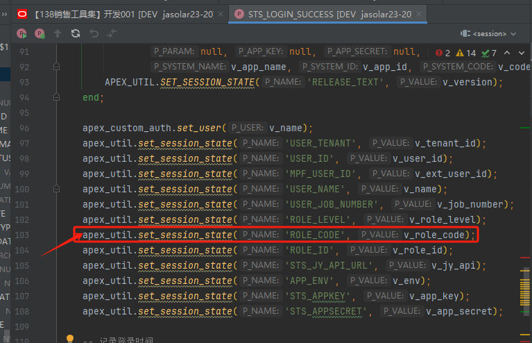 在登录后存储函数新增对应变量v_role_code,从角色表中获取对应role_code,最后存储到应用程序项中