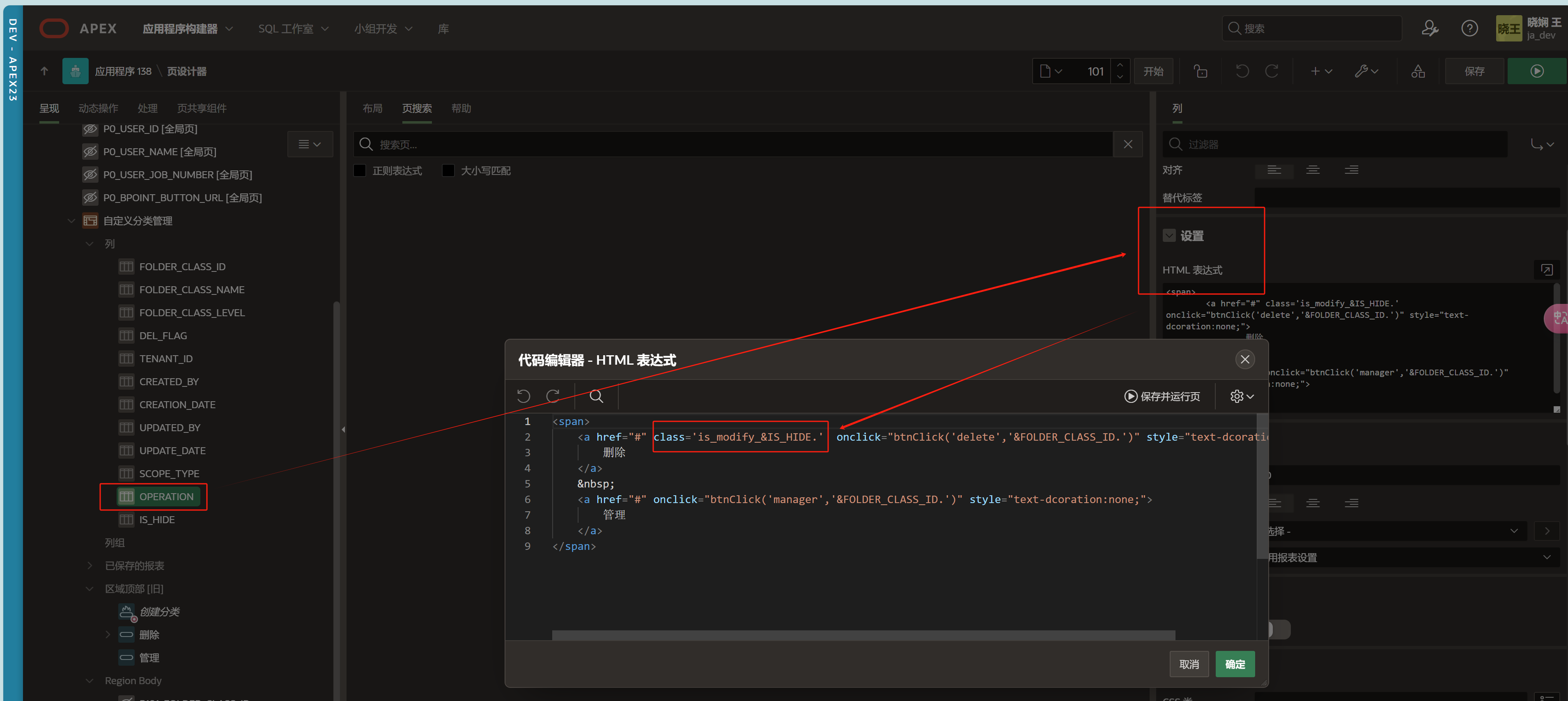 OPERATION操作列→设置 HTML表达式→新增一个动态CSS类,is_modify_X 后缀X使用动态变量&IS_HIDE.标识