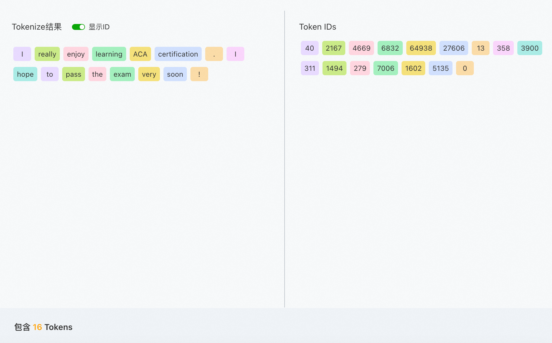 每一个token都会通过预先设置好的词表,映射为一个token id,这是token的“身份证",一句话最终会被表示为一个元素为token id的列表,供计算机进行下一步处理。
