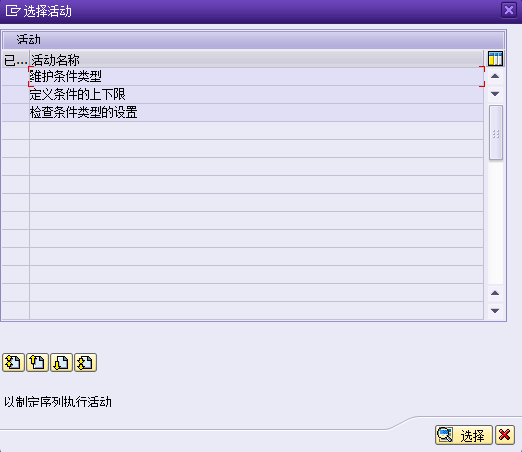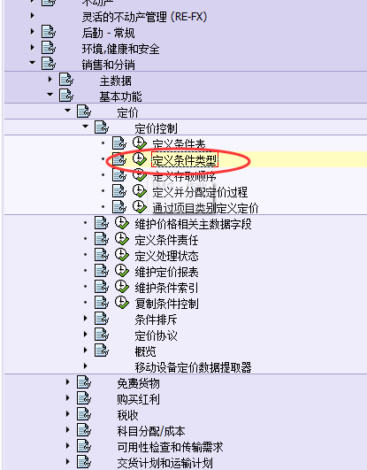 1.按后台IMG路径进入,如图 1所示执行,弹出对话框如图 2所示,鼠标点击“定义条件类型”项,进入图 3界面:
