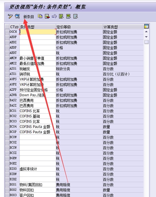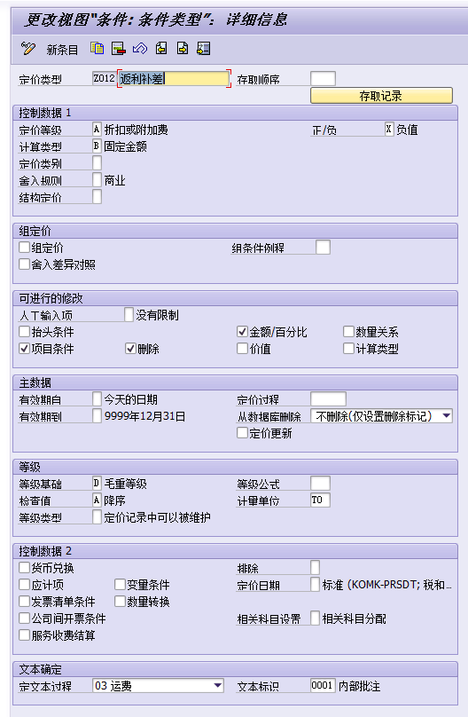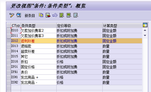 系统的示例配置中已有许多条件类型,可以拿来直接使用,销售价格维护可参见《维护条件记录_销售净价(PR00)》,销项税维护可参见《维护条件记录_销项税(MWST)》。