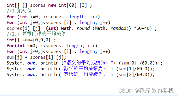 //假定班级有60名同学, 有三门课程:语文、数学、英语(成绩在40-100之间)计算三门课程的平均分