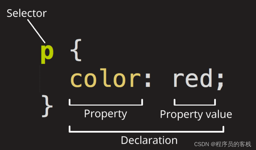 ①除了选择器部分,每个规则集都应该包含在成对的大括号里({})。