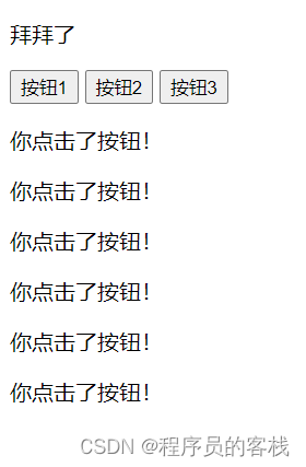 无论是点击哪一个按钮都会出现 你点击了按钮,点击完按钮1再点击按钮2文字会依次递增:
