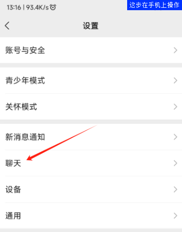 2,进入设置页面后,如果你的手机是安卓手机,就点【聊天】,如果是苹果手机就点【通用】