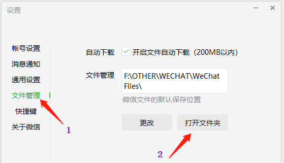 11,在出来的微信设置窗口中点【文件管理】-【打开文件夹】