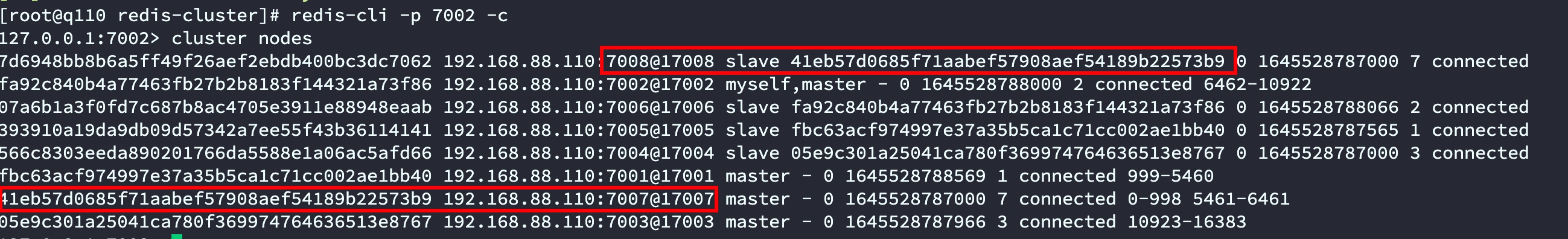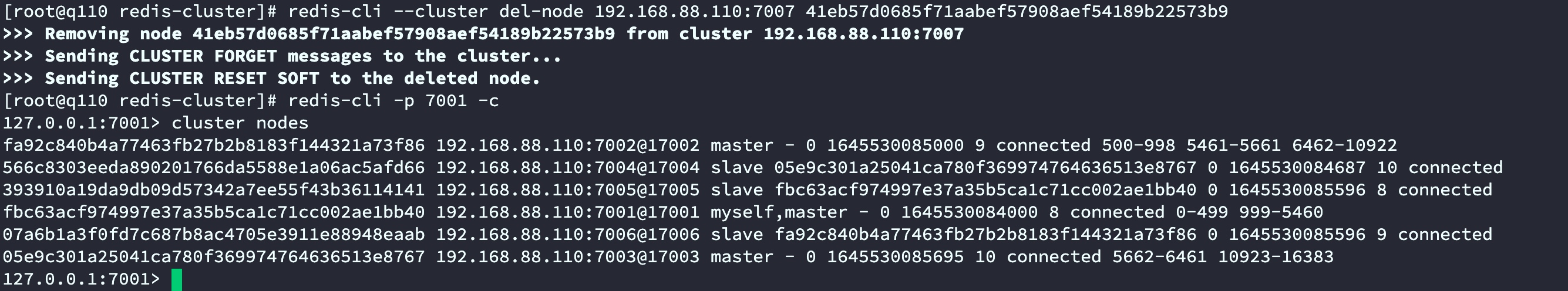 redis-cli --cluster del-node 192.168.88.110:7007 41eb57d0685f71aabef57908aef54189b22573b9集群节点查看:
