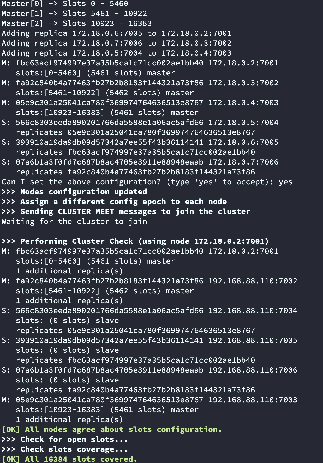 # 进入到任意一个安装好的redis节点的bin目录,里面有个脚本对象redis-cli,docker exec -it redis-7001 bashcd /usr/local/bin/# 执行集群创建./redis-cli --cluster create 172.18.0.2:7001 172.18.0.3:7002 172.18.0.4:7003 172.18.0.5:7004 172.18.0.6:7005 172.18.0.7:7006 --cluster-replicas 1