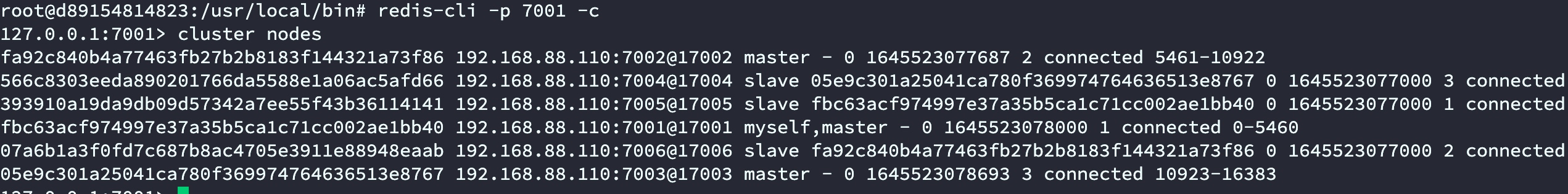 # 进入容器docker exec -it redis-7002 /bin/bash# 进入到redis-cli脚本目录 cd /usr/local/bin# 登录7002节点 ./redis-cli -p 7002 -c# 查询集群状态cluster nodes