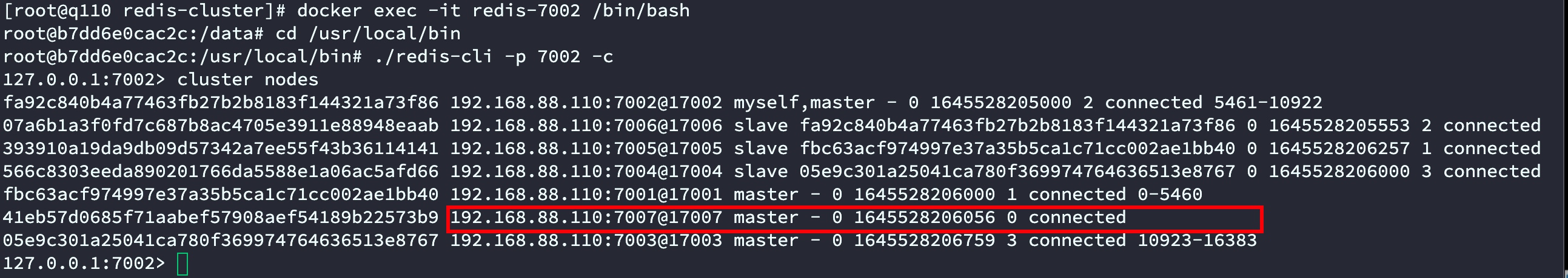 # 将192.168.88.110:7007节点添加到192.168.88.110:7001节点所在的集群中redis-cli --cluster add-node 192.168.88.110:7007 192.168.88.110:7001此时我们可以进入到集群节点之一查看此时的集群状态,我们进入到7002节点中输入cluster node查询,操作方法如下