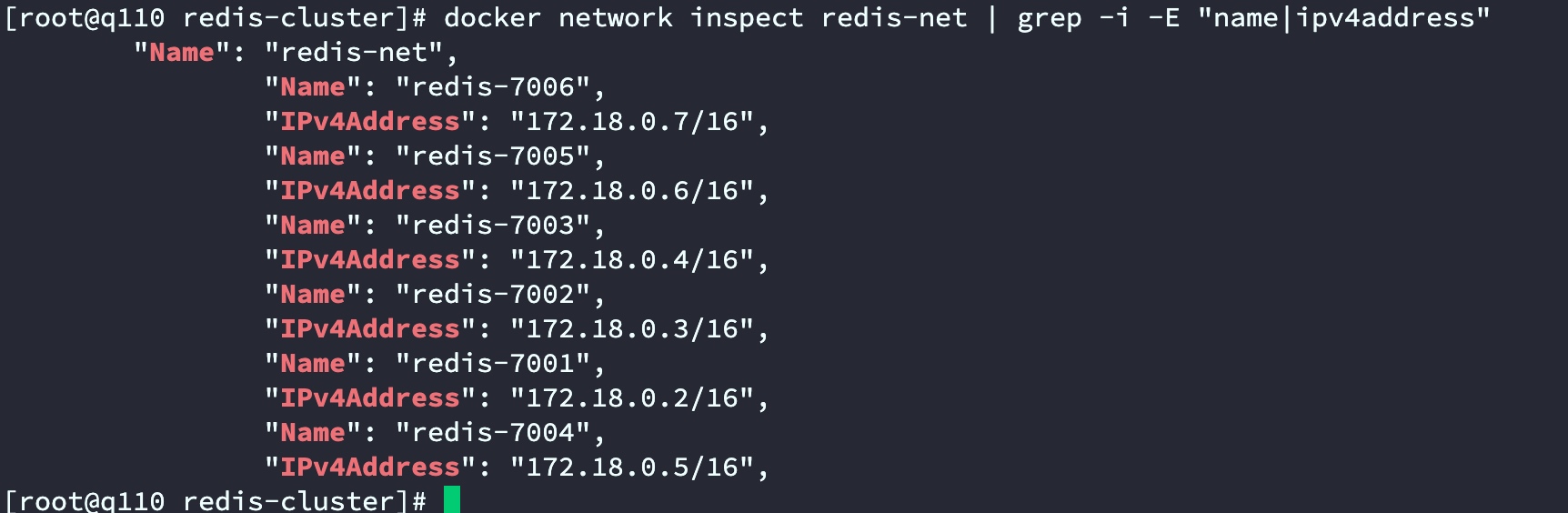 docker network inspect redis-net | grep -i -E "name|ipv4address"