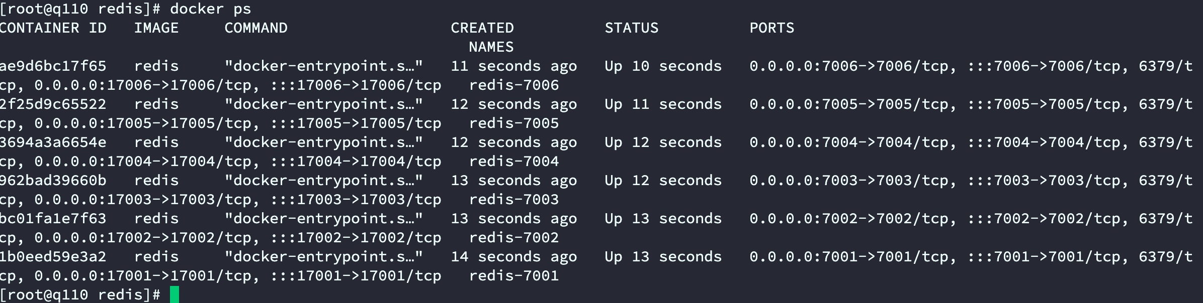 #!/bin/bash #在/usr/local/server/redis-cluster下生成conf和data目标,并生成配置信息 for port in `seq 7001 7006`;do mkdir -p ./${port}/conf && PORT=${port} envsubst < ./redis-cluster.tmpl > ./${port}/conf/redis.conf && mkdir -p ./${port}/data; done#创建6个redis容器for port in `seq 7001 7006`;do docker run -d -it -p ${port}:${port} -p 1${port}:1${port} -v /usr/local/server/redis-cluster/${port}/conf/redis.conf:/usr/local/etc/redis/redis.conf -v /usr/local/server/redis-cluster/${port}/data:/data --privileged=true --restart always --name redis-${port} --net redis-net --sysctl net.core.somaxconn=1024 redis redis-server /usr/local/etc/redis/redis.conf;done#查找ipfor port in `seq 7001 7006`; doecho -n "$(docker inspect --format '{{ (index .NetworkSettings.Networks "redis- net").IPAddress }}' "redis-${port}")":${port}" ";done#换行echo -e "