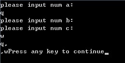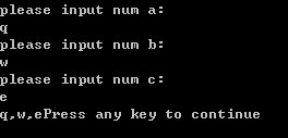 1 #include<stdio.h> 2 #include<stdlib.h> 3 int main(void) 4 { 5 char a,b,c; 6 printf("please input num a:\n"); 7 scanf("%c",&a); 8 printf("please input num b:\n"); 9 scanf("%c",&b); 10 printf("please input num c:\n"); 11 scanf("%c",&c); 12 printf("%c,%c,%c",a,b,c); 13 }