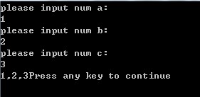 1 #include<stdio.h> 2 #include<stdlib.h> 3 int main(void) 4 { 5 int a,b,c; 6 printf("please input num a:\n"); 7 scanf("%d",&a); 8 printf("please input num b:\n"); 9 scanf("%d",&b); 10 printf("please input num c:\n"); 11 scanf("%d",&c); 12 printf("%d,%d,%d",a,b,c); 13 }
