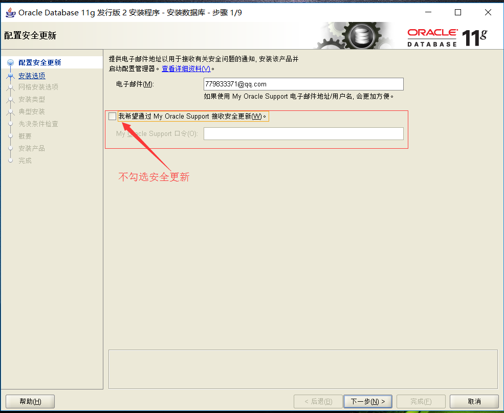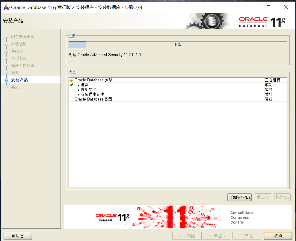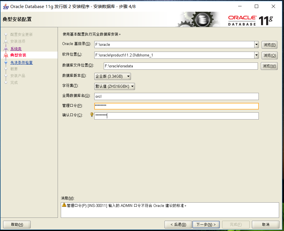 我用的win10安装的,在这里点下一步,会报什么:"[INS-13001] 环境不满足最低要求"的警告,好像是产品是win10之后才出来的,识别不了,不管,忽略继续安装
