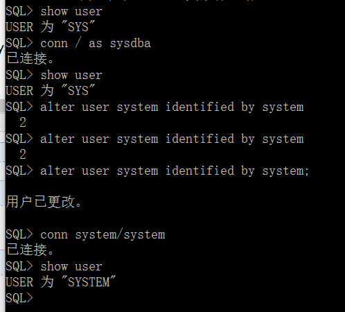 使用conn / as sysdba登录数据库,后,如果想修改system用户的密码,可以使用:alter user system identified by system;(by后为新密码);