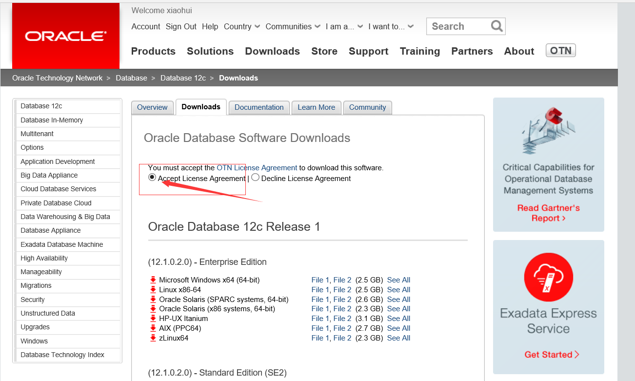 选择Windows 64的下载,选择file1,和file2,注意两个文件都要下载,下载时要求登录,有oracle账户的直接登录,没有注册一个吧,把这两个文件下载下来