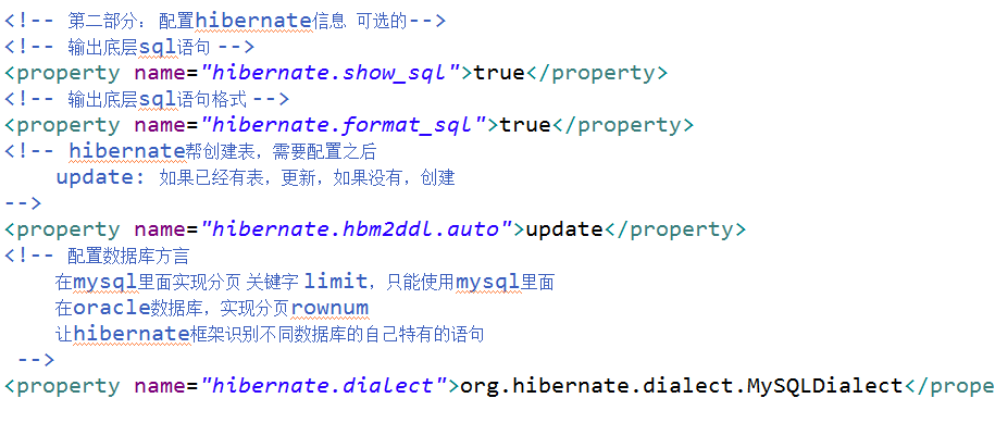 12 13 <!--2. 配置hibernate信息 可选的 --> 14 <!-- 自动建立表 --> 15 <property name="hibernate.hbm2ddl.auto">update</property> 16 <!-- 控制台打印底层sql语句 --> 17 <property name="show_sql">true</property> 18 <!-- 格式化控制台打印的sql语句 --> 19 <property name="format_sql">true</property> 20 21 <!-- 定义方言 --> 22 <property name="hibernate.dialect">org.hibernate.dialect.MySQLDialect</property> 23 24 <!--3. 把映射文件放到核心配置文件中 resource属性:给出关系映射文件的路径--> 25 <!-- 类的全路径 和文件的全路径是不同的 user类的全路径是:org.model.User User.hbm.xml文件的全路径是: 26 /Hibernate1_Demo1/src/org/model/User.hbm.xml 但是因为核心配置文件的位置是在src下 所以/org/model/User.hbm.xml即可 27 ctrl单击 如果到达指定的文件 说明路径配置正确--> 28 <mapping resource="org/model/User.hbm.xml"/> 29 </session-factory> 30 </hibernate-configuration>