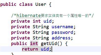1 <hibernate-mapping> 2 <!-- 1 配置类和表对应 3 class标签 4 name属性:实体类全路径 5 table属性:数据库表名称 6 --> 7 <class name="cn.itcast.entity.User" table="t_user"> 8 <!-- 2 配置实体类id和表id对应 9 hibernate要求实体类有一个属性唯一值 10 hibernate要求表有字段作为唯一值 11 --> 12 <!-- id标签 13 name属性:实体类里面id属性名称 14 column属性:生成的表字段名称 15 --> 16 <id name="uid" column="uid"> 17 <!-- 设置数据库表id增长策略 18 native:生成表id值就是主键自动增长 19 --> 20 <generator class="native"></generator> 21 </id> 22 <!-- 配置其他属性和表字段对应 23 name属性:实体类属性名称 24 column属性:生成表字段名称 可以任意命名 但是一般让它实体类中的属性名 称一样 25 --> 26 <property name="username" column="username"></property> 27 <property name="password" column="password"></property> 28 <property name="address" column="address"></property> 29 </class> 30 </hibernate-mapping>