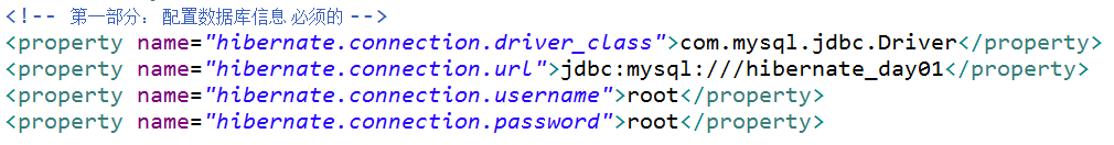 1 <?xml version="1.0" encoding="UTF-8"?> 2 <!DOCTYPE hibernate-configuration PUBLIC 3 "-//Hibernate/Hibernate Configuration DTD 3.0//EN" 4 "http://www.hibernate.org/dtd/hibernate-configuration-3.0.dtd"> 5 <hibernate-configuration> 6 <session-factory> 7 <!--1. 配置数据库信息 --> 8 <property name="hibernate.connection.driver_class">com.mysql.jdbc.Driver</property> 9 <property name="hibernate.connection.username">root</property> 10 <property name="hibernate.connection.password">jay571018</property> 11 <property name="hibernate.connection.url">jdbc:mysql:///hibernate1_demo1</property>