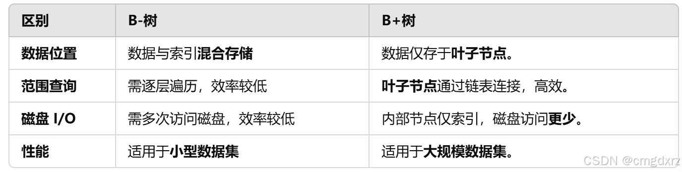 - 叶子节点双向链表,所有数据都维护在叶子节点一一对范围查询和排序性能更好