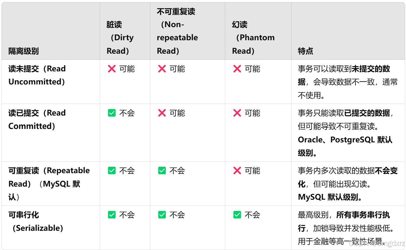 并发事务之间互不干扰,事务的执行过程对其他事务不可见,直到提交后才可见