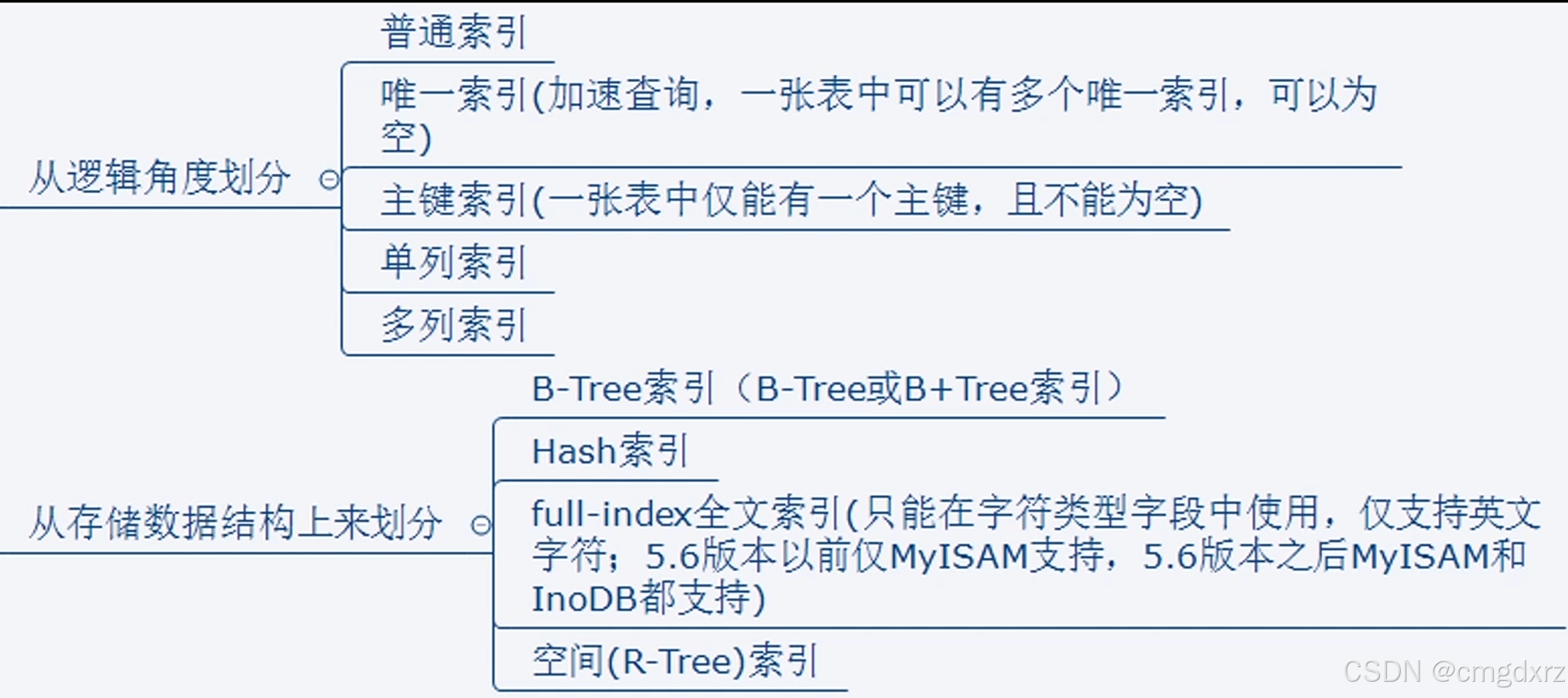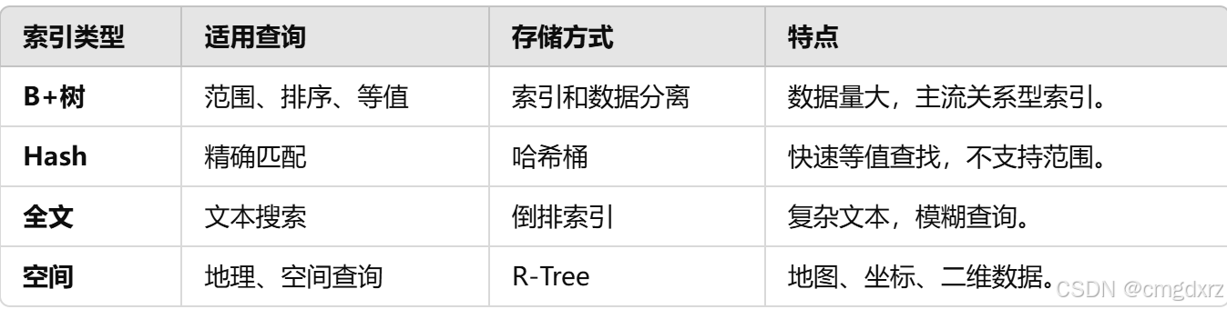- 索引是对数据库中的某些关键字段进行存储,类似于数据中的目录,里面包含了关键数据和数据的位置,通常需要对where条件后的字段加索引,不能加太多,一个表不超过4个索引。