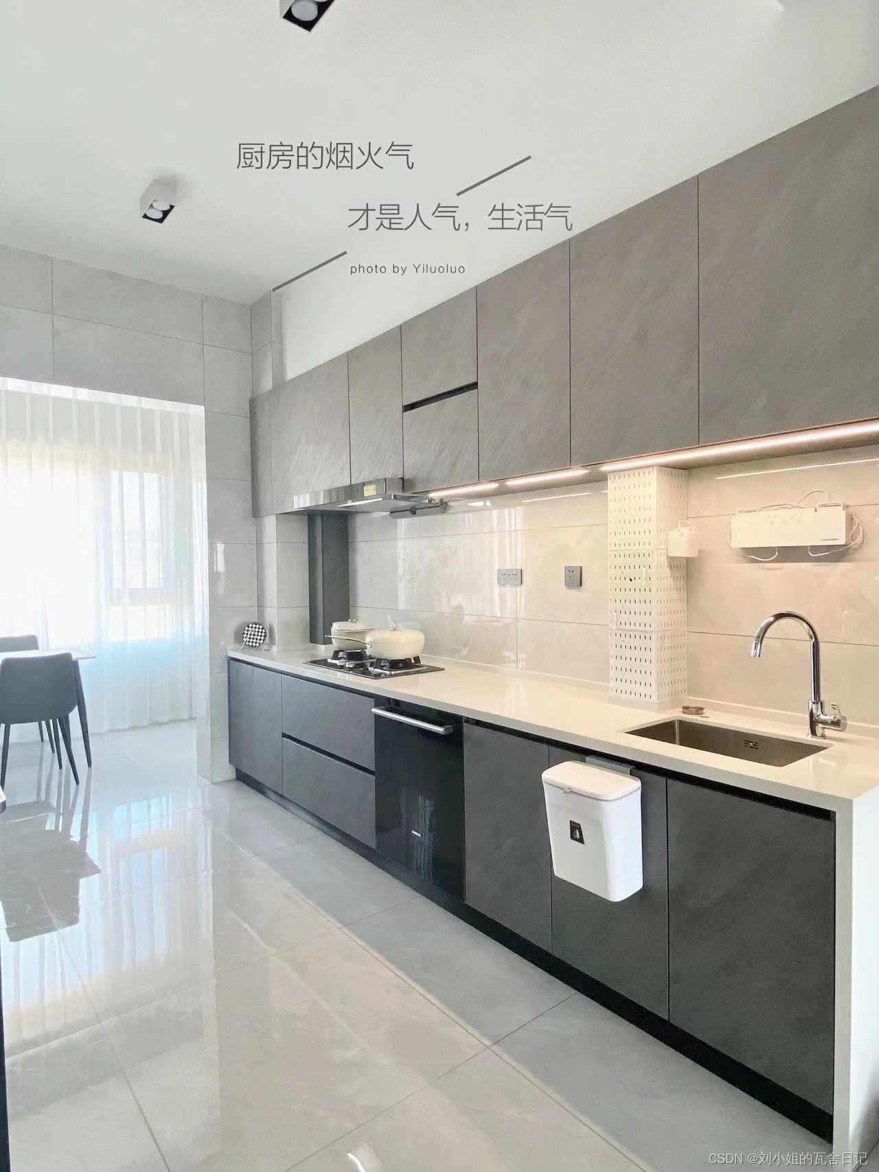 开放式的布局,一字型的设计,做一个岛台,可以是厨房里的操作台,也可以作为吧台使用,摆放上几把高脚椅,打开吊灯,就很有气氛。