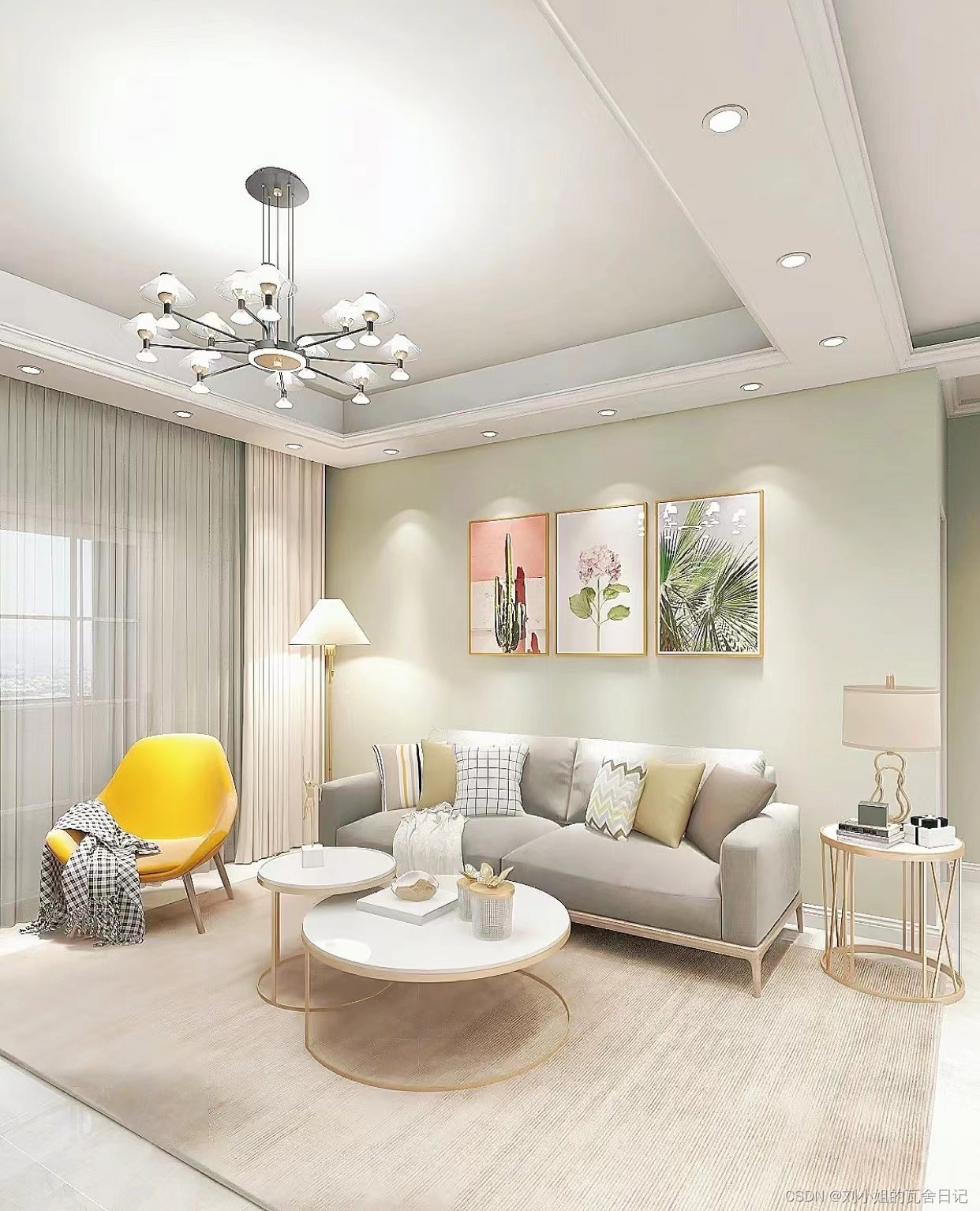 客厅背景墙以简洁为主,搭配绿色油画,在轻奢的同时又多了一份清新内嵌式的电视搭配米白色沙发,还有轻奢感的小茶几轻奢优雅北欧的高端扑面而来