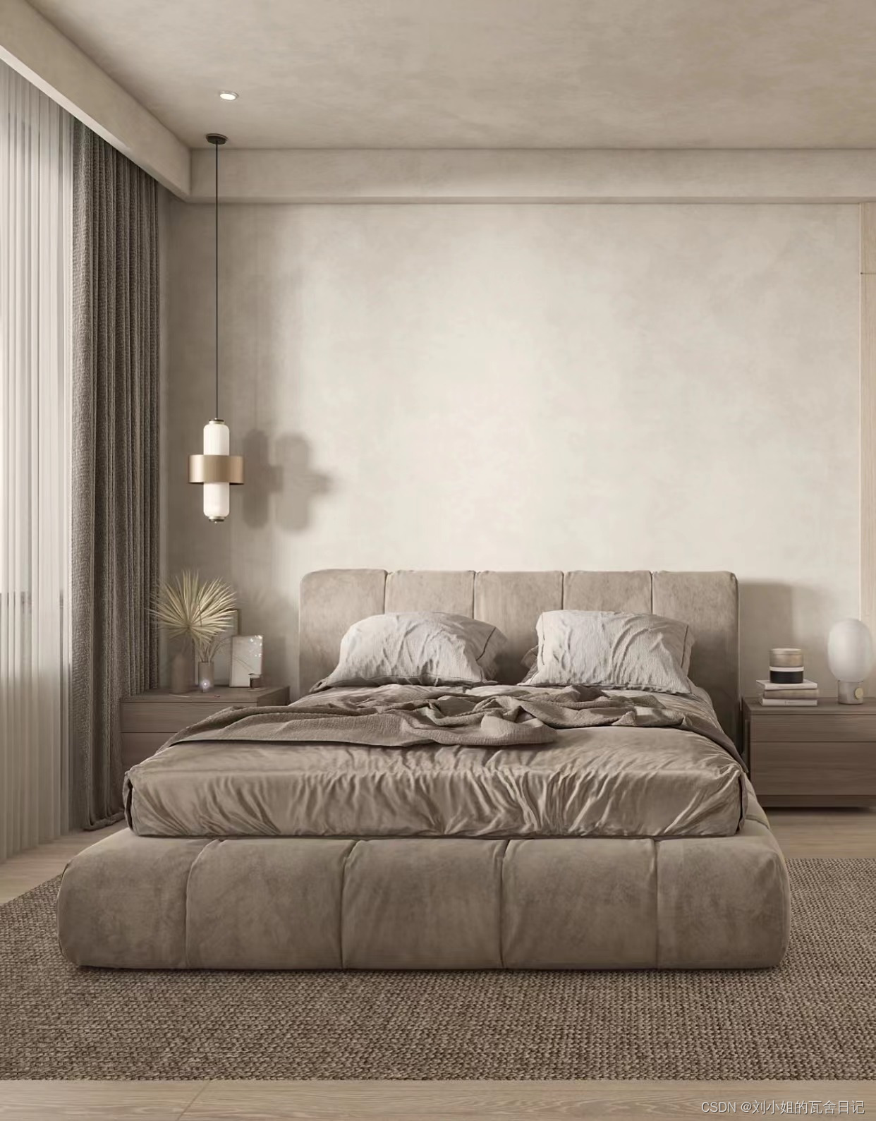 质地」才是侘寂风的关键,侘寂风主张不加以修饰、自然呈现岁月刻蚀下特有的斑驳黯淡。用水泥、硅藻土、艺术涂料等能呈现原始、粗糙手感的漆料再搭配中性色调是最适合的。