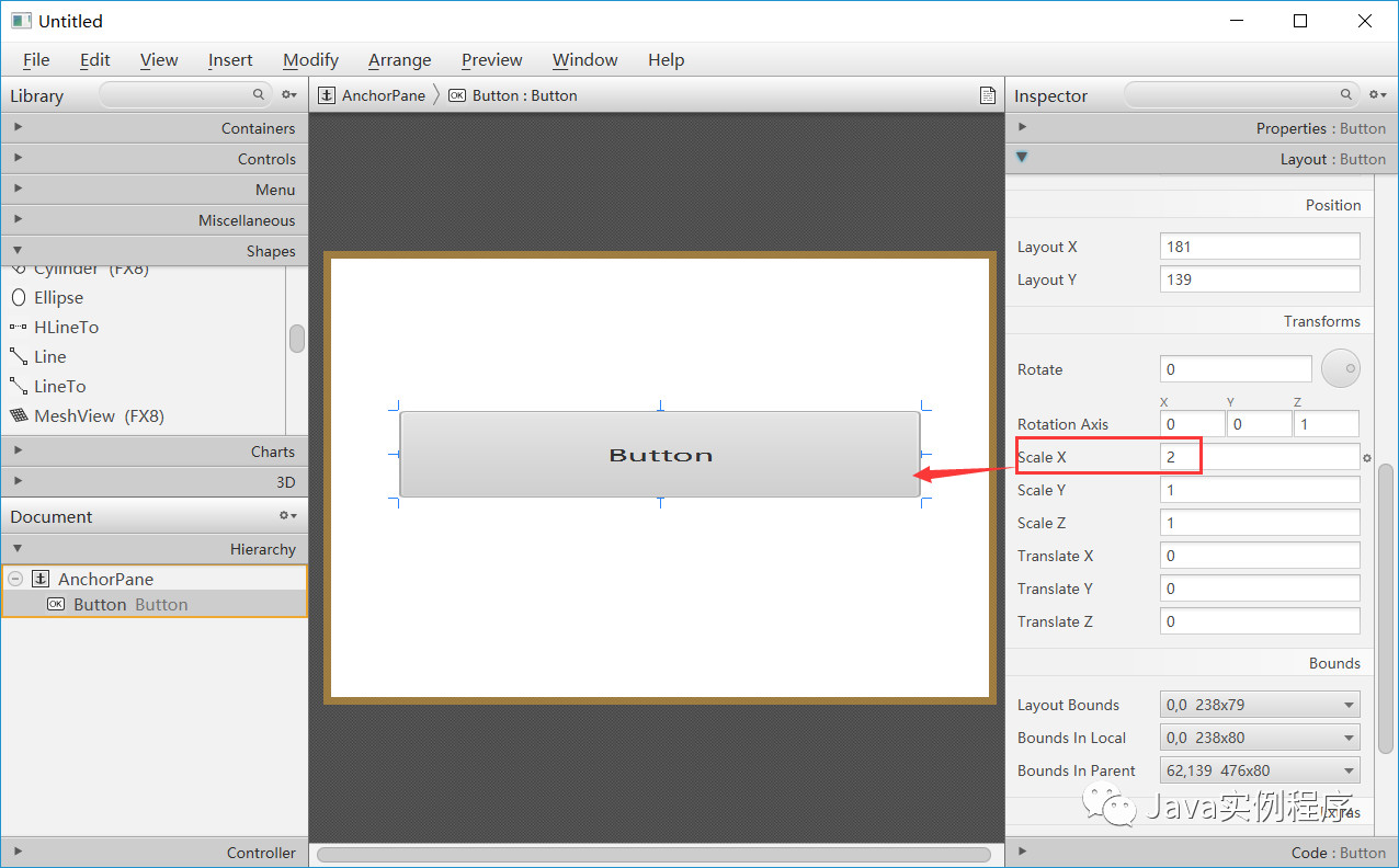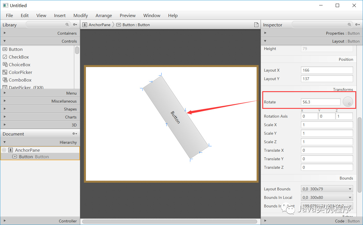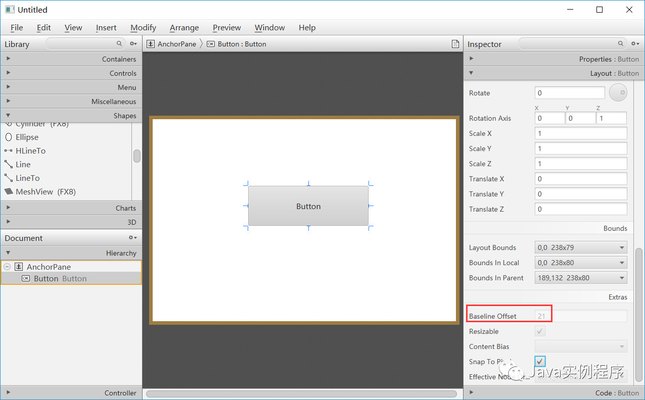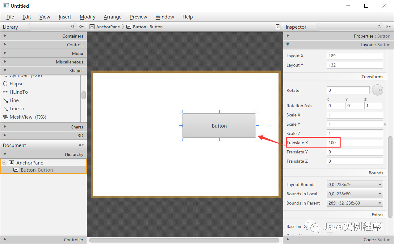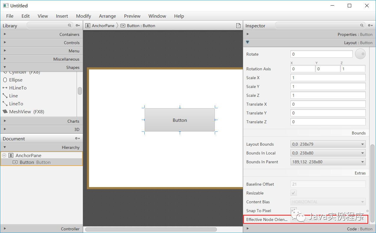 需要注意的是layoutX,layoutY,translateX,和 translateY变量没有在layoutBounds。这很重要,因为布局代码必须首先确定节点的当前大小和位置(使用layoutBounds),然后进行设置 layoutX和layoutY调整节点的平移,以使其具有所需的布局位置。