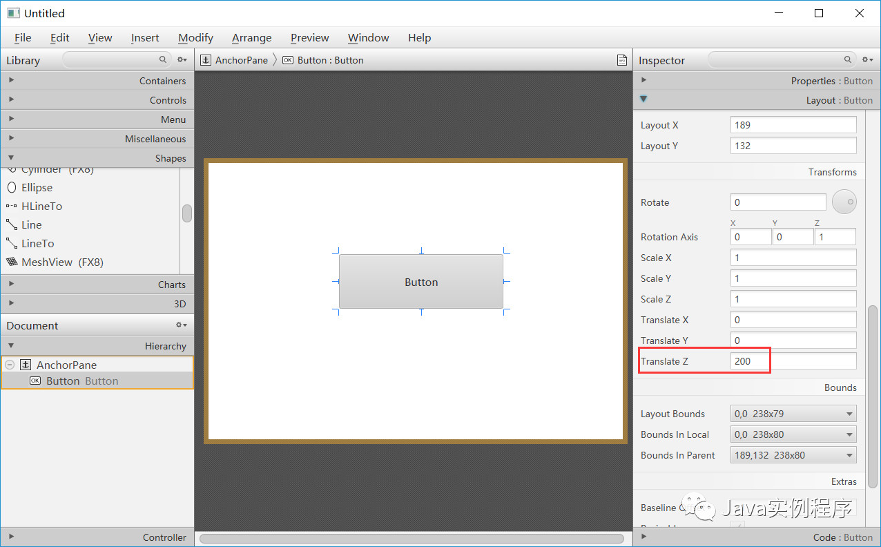 请注意,每当节点的几何形状发生变化时,就会自动重新计算boundsInLocal。因此,将节点中的任何这些值绑定到依赖于此变量的表达式是错误的。例如,形状的x或y变量绝不应绑定到boundsInLocal来定位节点。
