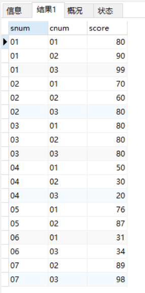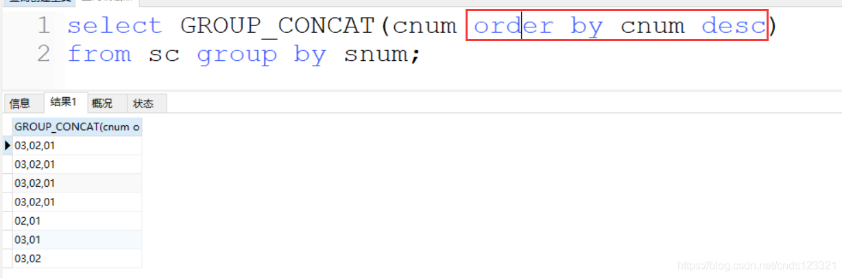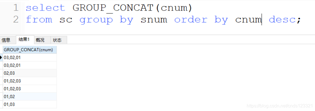 可以发现把同一组的cnum字段都连接成一个字符串了。但我们遇到一个问题,发现'01'、'02'和'03'是同一组的,如果按照升序或者降序,那么前四个的字符串应该相同,但遗憾的是四个字符串并不相同,所以我们想到了排序来解决这个问题,如下: