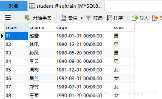 INSERT INTO student(snum,sname,sage,ssex) VALUES ('01','赵雷','1990-01-01','男');