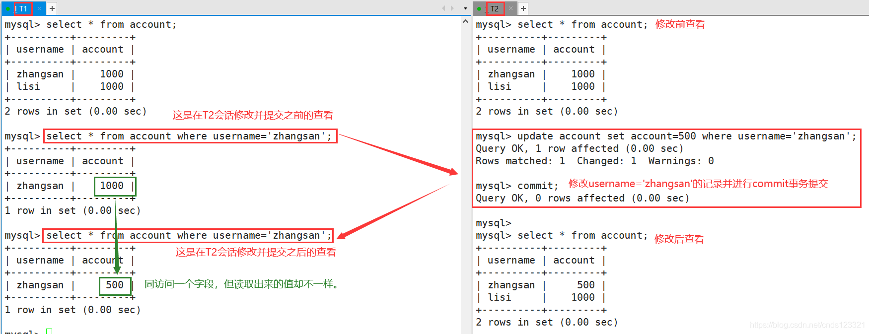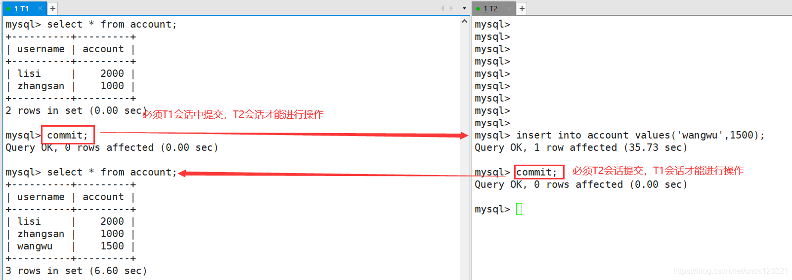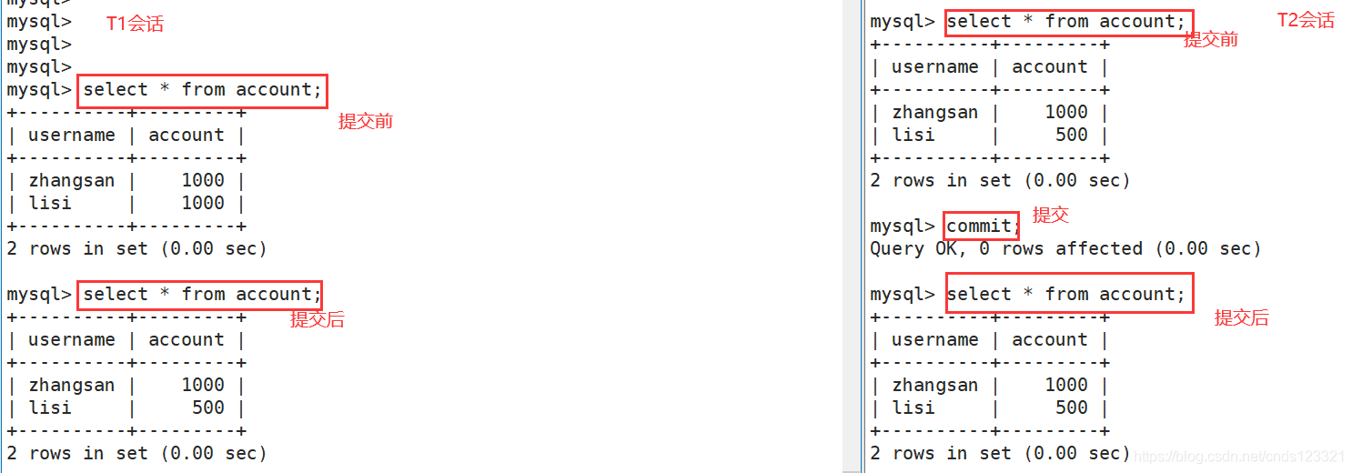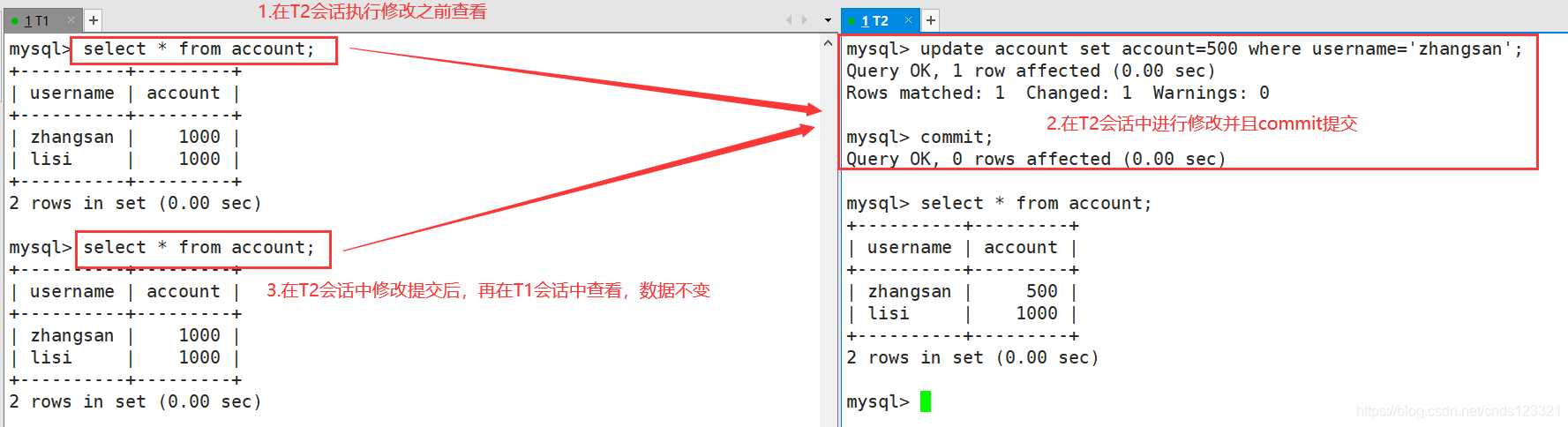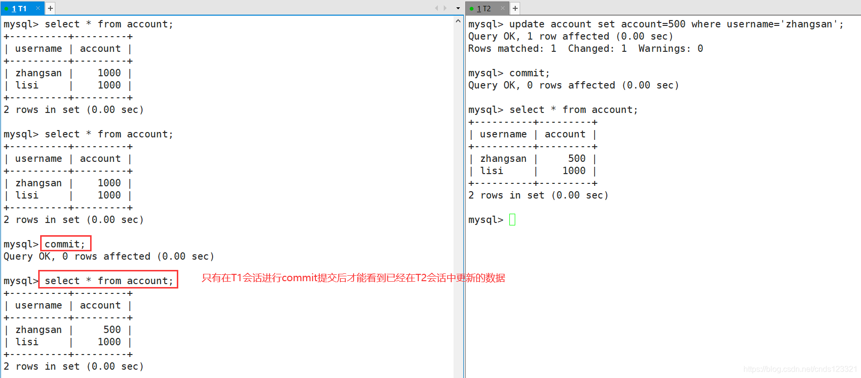 只有当在T1会话中commit提交后才能看到已经在T2会话中更新的数据。