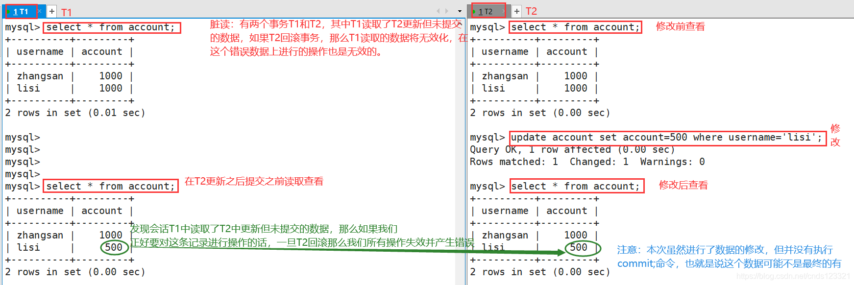 脏读的模拟过程:建立两个MySQL会话,分别为T1和T2,先在两个会话中查看account表的内容,都是一致的;接着在T2会话中执行一条UPDATE语句,对表中username为'lisi'的account字段进行了修改,但没有执行commit语句提交事务,这时候在T2会话中查看表的记录,是正确的,但在其他会话T1中查看表的记录已经是修改后的记录,如果这时候我们对这条username为'lisi'的记录进行操作,但恰巧T2会话回滚了刚才的操作,那么T1会话所做的事情都将会失效,因为这是错误的数据,这也就是脏读问题。