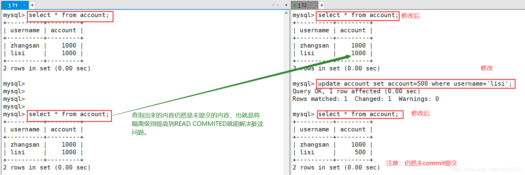 执行set tx_isolation='READ-COMMITTED';命令修改隔离级别为READ COMMITED读已提交来解决脏读问题,在修改隔离级别后还需要执行commit;命令,因为刚才已经关闭了事务的自动提交,所以需要手动提交修改。注意:要回滚到'lisi'的account为1000,否则后面不方便查看。