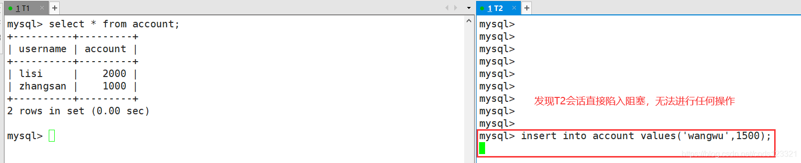 要解决幻读问题,需要将隔离级别调到SERIALIZABLE,执行set tx_isolation='SERIALIZABLE';命令修改隔离级别为SERIALIZABLE串行化来解决幻读问题,在修改隔离级别后还需要执行commit;命令,因为刚才已经关闭了事务的自动提交,所以需要手动提交修改。注意:要回滚到'lisi'的account为1000,否则后面不方便查看。