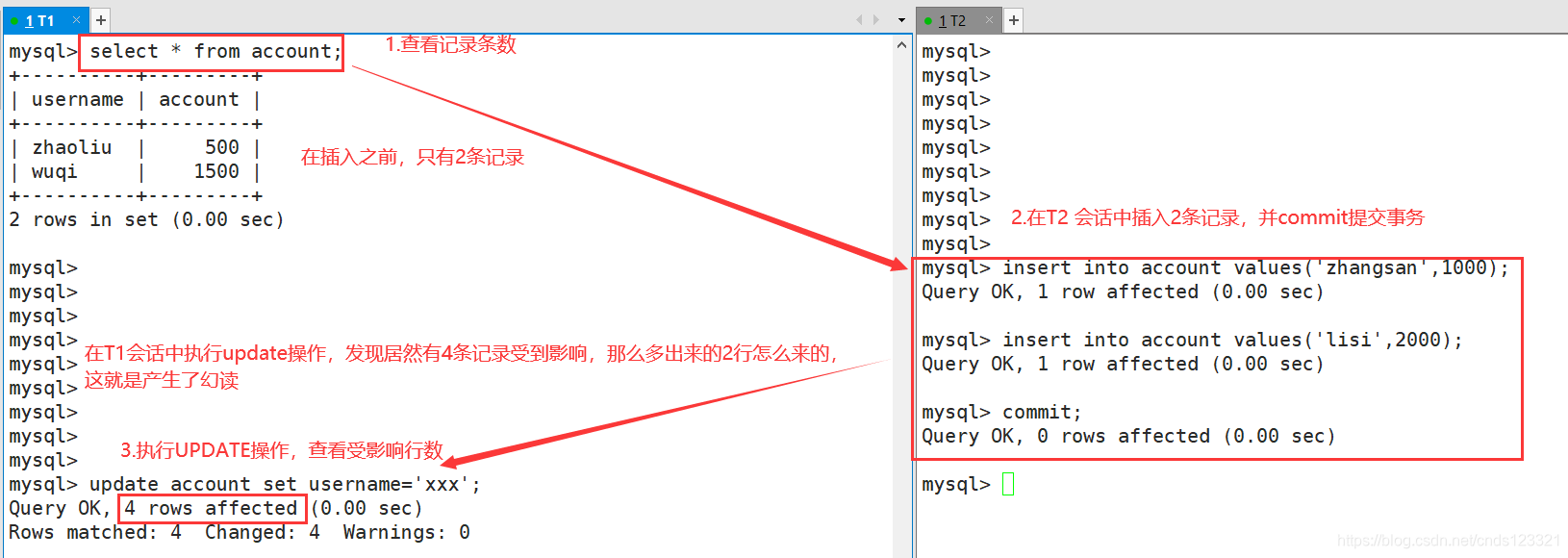 幻读过程模拟:先在1会话中查看记录条数,接着在T2会话中执行插入操作并进行commit提交,最后在T1会话中执行UPDATE操作,本来受影响的行数应该是2行,但实际上却是4行,这就是产生了幻读。