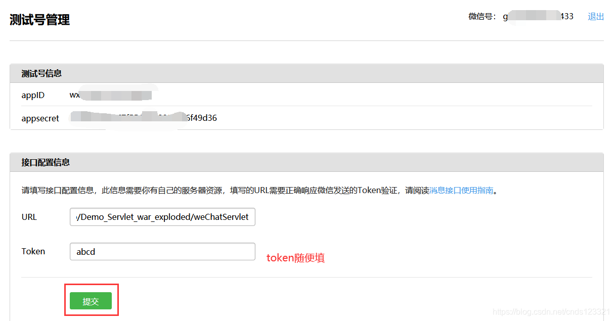 注意,如果URL中的"weChatServlet"后面不能跟其他符号,因为是GET请求后面要拼接参数的,否则会失败。