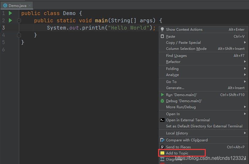 但通常笔记是与代码相关的,将光标放在代码中某一行,然后鼠标右键单击,在出现的面板中选择"Add to Topic“。(注意,至少要先创建一个topic在下面的面板中,右键弹出才会出现"Add to Topic"选项。)