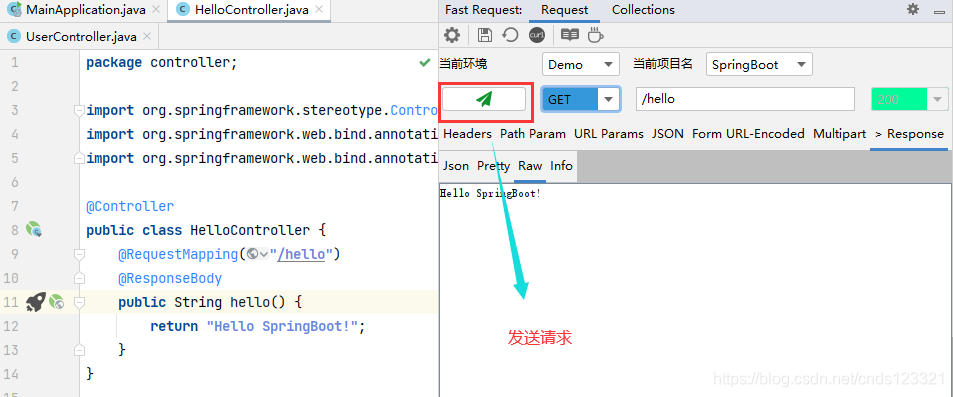 点击快速请求图标,然后点击发送按钮,就可以发送该方法的请求了。