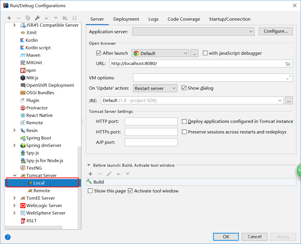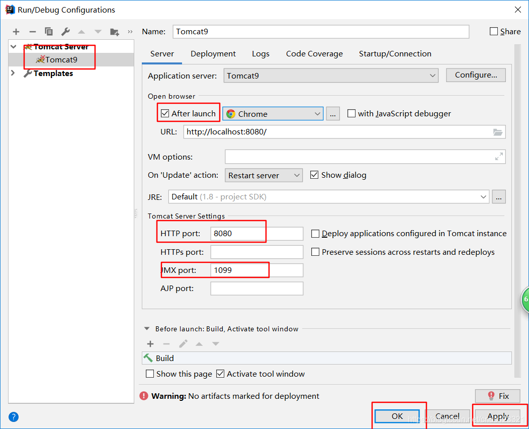 在“Server”面板中,勾选取消“After Launch”,设置“HTTP port”和“JMX port”(默认值即可),点击Apply -> OK,至此tomcat配置完毕(左边列表中tomcat图标上小红叉是未部署项目的提示,部署项目后就会消失)。