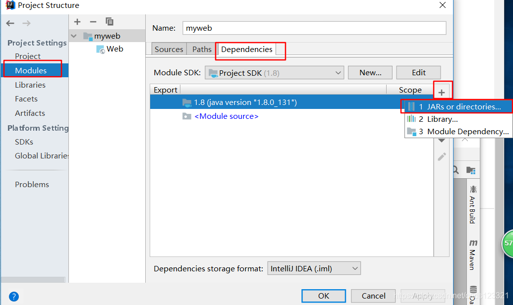 选择当前窗口的Dependencies -> 将Module SDK选择为1.6 ->点击右边的 + 号 -> 选择 “1 JARS or directories ...”